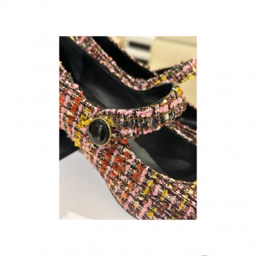 Mary Jane cleavage on a 5 cm heel, made with black and white rice grain fabric with a spike and heel covered in soft black varnish. Featuring an elegant chain accessory on a silver strap, with a pearl-enriched button. A refined and chic footwear option, perfect for a sophisticated and fashionable look.