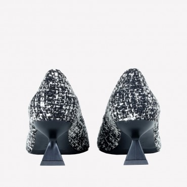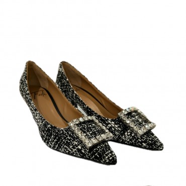 5 cm triangular heel decolleté, enriched with a square buckle with jet black crystals, made of an elegant white and black rice grain fabric. A refined and sophisticated footwear option, perfect to complete your look with style and glamour.