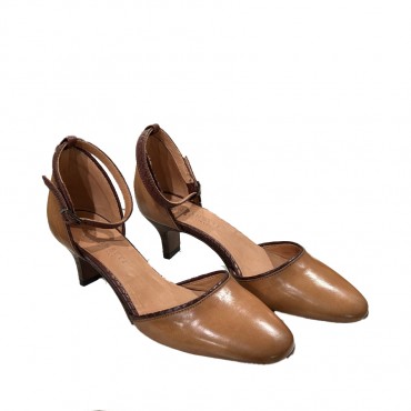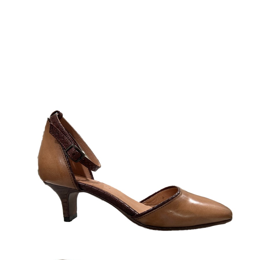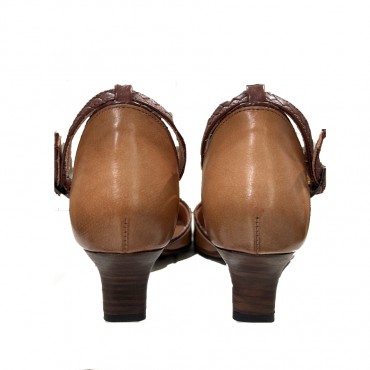 Take-off with ankle strap Pantanetti brown, made of aged leather and carried in python print calfskin.