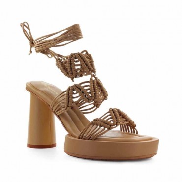 Franzi women's sandal model by Paloma Barceló made of soft hazelnut leather, characterized by intertwined straps and ankle laces closure. Padded insole and rubber sole, 10.5 cm heel height.