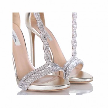 Woman's sandal model in platinum laminated effect leather with clear rhinestone embroidery. These sandals are designed to celebrate the femininity of every Ninalilou woman who wears it. Studded with rhinestones, it gives an extra touch of light to any look that matches it.