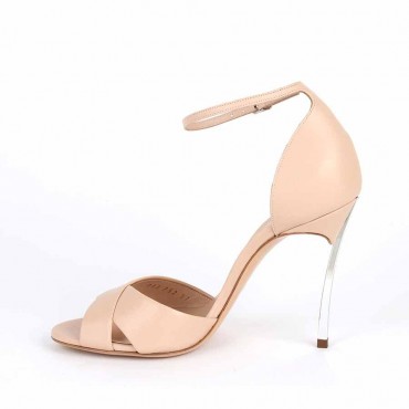 Model women's sandals in high quality calf nappa leather in powder color on Blade steel heel. The Blade sandal with criss-cross motif in Nappa Powder pink leather represents the perfect sandal for any occasion, thanks to its delicate and versatile colour, while the thin ankle strap ensures its fit. This iconic style of the Casadei maison, with a contemporary design, stands out on the Blade stiletto heel in hardened steel, giving strength and character and elegantly slimming the female figure.