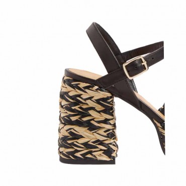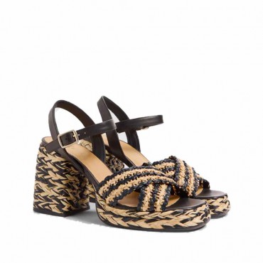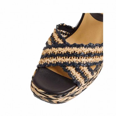 Sandal model in two-tone black and natural tostado raffia. Amaze like never before with the elegant two-tone raffia finish of the Vincen sandal. Handmade on a square open toe and with a strap closed with a metal buckle, opening on the back of the heel Height 9 cm at the heel INTERNAL COMPOSITION: 100% SHEEP LEATHER EXTERNAL COMPOSITION: 70% VISCOSE RAFFIA, 10% POLYESTER, 20% CALF LEATHER SOLE MATERIAL: CUEROLITE TOTAL HEIGHT: 9CM PLATFORM/HEIGHT: 2CM WEDGE/HEEL HEIGHT: 7CM