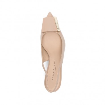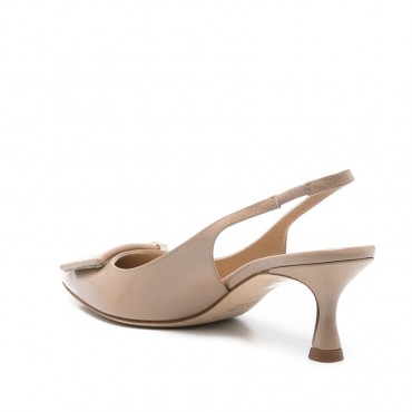 MEDINA is a brushed leather slingback, featuring an elegant leather and gold accessory. With a 50 mm heel, it offers the perfect mix of comfort and style. The pointed coated accessory, contrasting with the upper, is embellished with a gold metal detail that adds a modern and refined touch. Ideal for those looking for a chic and versatile look, Arienne is perfect to complete day or evening outfits with distinctive and sophisticated elegance.
