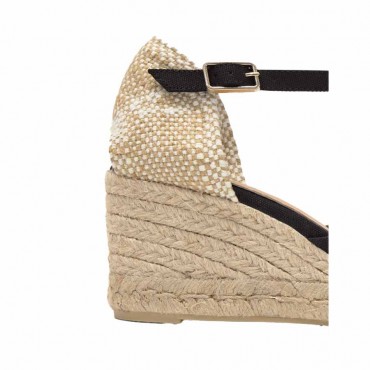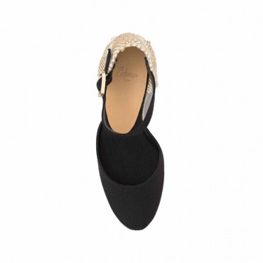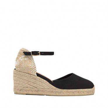 Chiarita espadrille sandal model in black organic cotton. Carol conical espadrille in organic cotton with strap closure, padded insole, and 7 cm jute wedge.