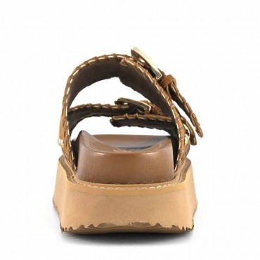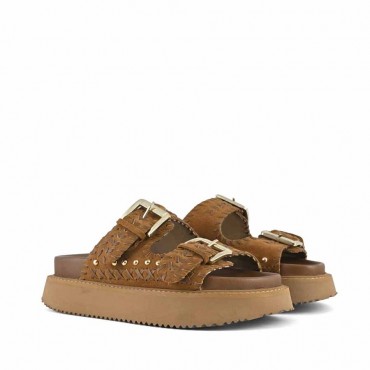 Women's slipper sandal model with wedge bottom in brown split leather with solid color leather threads. Of great personality and style, the double leather band platform. Embellished with studs and ethnic threads along the profiles. A shoe that combines the beauty of metropolitan style with the practical versatility of holiday destinations. A large patterned long dress or a sparkling mini dress are the perfect day-evening variations for this model.