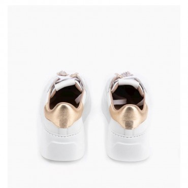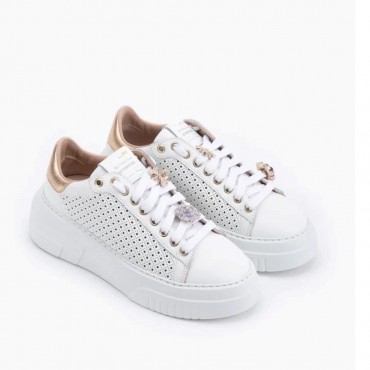 Women's sneakers in perforated white tassel with jewel accessory in the shape of a bee and flower Gold eyelets and detail always in gold leather on the back. Removable anatomical underpad in leather that guarantees comfort and well-being. Soft rubber sole with 5.5 cm heel. Handcrafted product made with fine materials made in Italy.