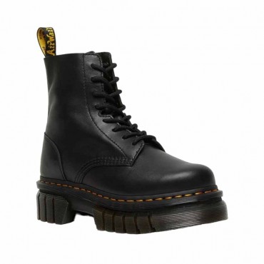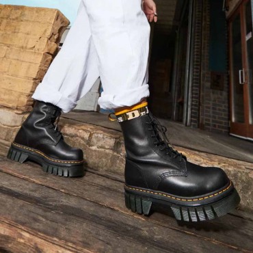 Women's military boots model more aggressive evolution of our 8-eye amphibian. A dizzying platform. To wear every day. These next-generation boots bring the full height of our renowned Quad platform to an ultra-lightweight, cutting-edge silhouette. The DM's spirit is pushed to the maximum thanks to the innovative two-part sole that gives more freedom to your movements: the light EVA sole and a PVC one with sturdy serrated studs. The boots also feature all of our DNA, including an amplified version of our signature outsole, yellow stitching and an Airwair logo heel loop. Nappa Lux is a classic leather that is soft and smooth to the touch. Our Goodyear welt lines are heat sealed at 700°C and reinforced with our signature stitching