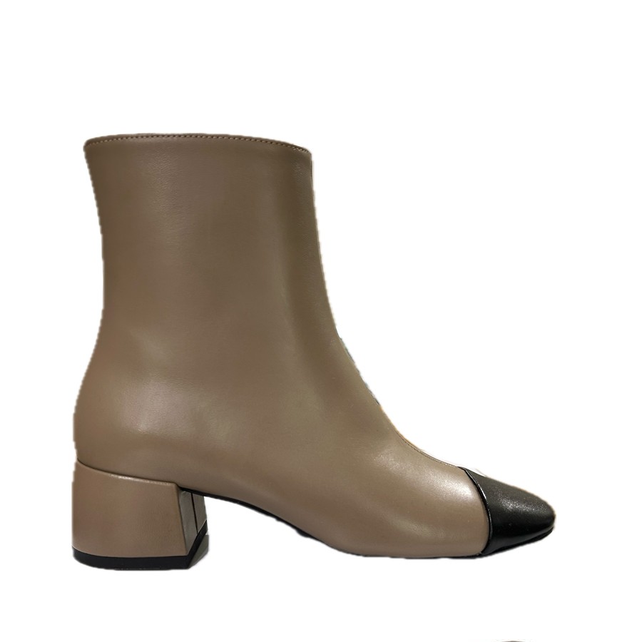 Women's boot on a 5 cm heel, made of taupe leather with black toe with side zip for a comfortable fit.