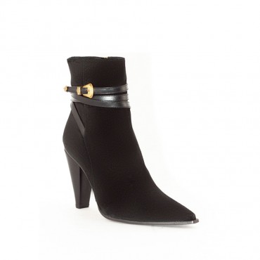Dina black suede tie with gold metal buckle, pointed design, internal zip closure, tie on the back, leather sole with logo.
