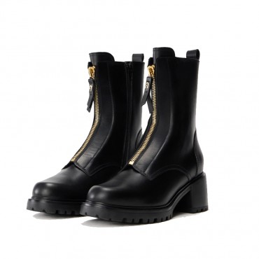 Decisive and contemporary elegance: The Furla leather boot with high rubber soles, is the perfect ally for a sophisticated but gritty style. The front zip in gold enhances the intense black of the calfskin, while the chunky sole gives a modern touch and guarantees comfort throughout the day. A model of character, ideal to stand out with class in every occasion.