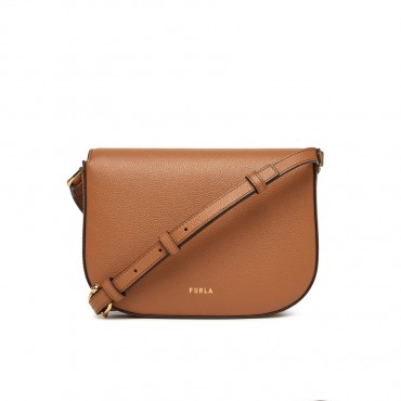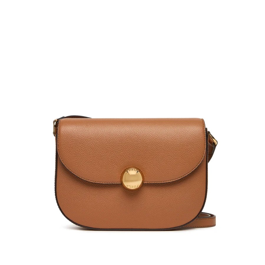 Perfect crossbody with a timeless allure: Furla Moonlight stands out for its saddle design with rounded soft lines. The body of the bag is entirely made of fine leather with a light hammered finish. The small and compact format is made distinctive by the closure with flap and magnetic button decorated with the iconic Ball logo. - Internal pocket with zip closure - Adjustable leather shoulder strap - Printed Furla logo