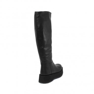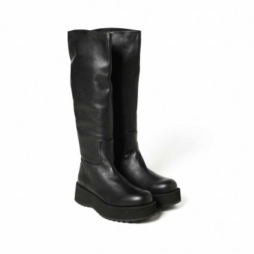 Gema napasoft black knee-high boot model for woman in leather and black elastic. Easy fit thanks to the zip along the inner side. Stem height 40 cm. Round shape and rock bottom with a distinctive EVA design: heel height 6 cm plat front 5 cm. Can be used under dresses and skirts to play down a romantic look.