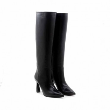 Boot Woman tube model on heel in black calf leather. On 10 cm perched heel and thin rubber sole. Tube fit for a soft effect on the leg. The boot with a sober line can be used in everyday life, but also under dresses for a formal and refined look. The thin rubber sole and a light anti-slip notch and leg to touch the knee 50 cm from the ground. Exclusive design and Made in Italy production