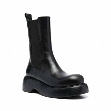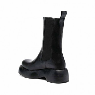 Model women's 3/4 Marlon black beatles boots in leather and black elastic. Fitting facilitated by the elastic on the sides and by the tie rod at the rear apex. Stem height 20 cm. Round shape and rock bottom with a distinctive EVA design: heel height 6.5 cm plat front 3.7 cm.