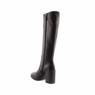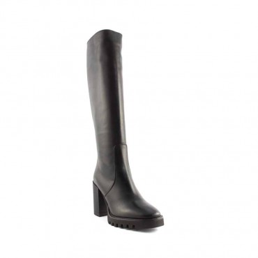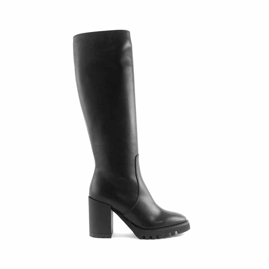 Model woman tube on heel in calfskin black color . On a 10 cm wide commato effect heel and rock rubber sole with a slight platform effect. Tight fitting tube with easy fit thanks to the internal boot zip. The boot with a sober line can be used in everyday life, but also under dresses for a formal and refined look. The thin rubber sole and a marked rock notch and leg to touch the knee 37 cm.