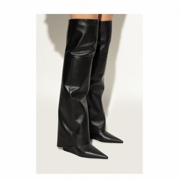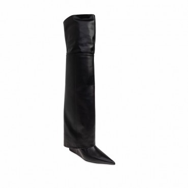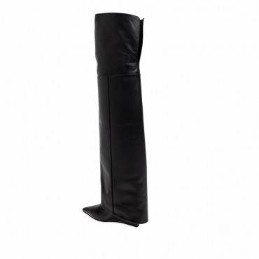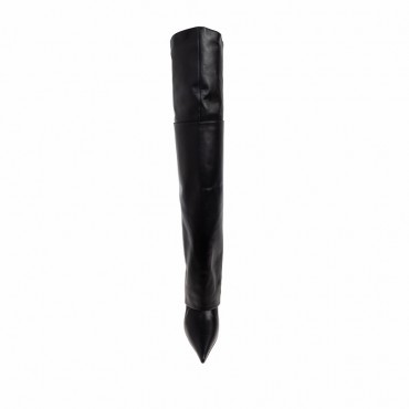 Model: Vic Matie's over-the-knee leather boots are an exceptional expression of elegance and contemporary boldness. Their elongated, geometric shaft, extending above the knee, captivates with the avant-garde simplicity of their lines and their tubular effect. The sharp, sculpted toe gives the boots a distinctive character, perfectly accentuating the dynamic, urban silhouette of the modern woman. The extraordinary softness of the natural black leather, both inside and out, ensures extraordinary comfort and durability, while discreet stitching separates the shaft segments without unnecessary embellishments or visible logos. The smooth texture of the leather, combined with a modern rubber sole, emphasizes the minimalist design: a statement of liberated femininity, beyond the dictates of passing trends. Why is this product worth buying? Exceptional craftsmanship in natural leather. Unique, minimalist aesthetic, free of unnecessary embellishments. A cutting-edge character, highlighted by the sharp toe and wide shaft. Comfortable and durable rubber sole. A design inspired by art and urban lifestyle, by Vic Matie.