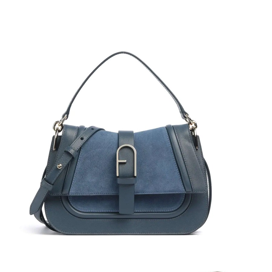Versatile and compact: Furla Flow is a perfect ally for the winter season. In soft suede leather with smooth calfskin details, it is made distinctive by the decorative buckle with the iconic logo at the closure of the front flap. The soft trapezoid shape with rounded lines make it perfect for storing all your belongings. An accessory with multiple modes of use: as a top handle, as a crossbody or shoulder. - Open inner wall pocket - Short smooth leather upper handle - Adjustable and removable long shoulder strap in smooth leather - Flap closure with magnet button