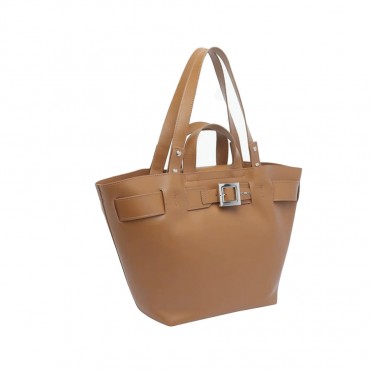 Bardo' bucket bag in tobacco leather with a double handle, tobacco brown in color. Made of soft calfskin, it features wide double leather handles for shoulder or hand carry. Magnetic clip closure.