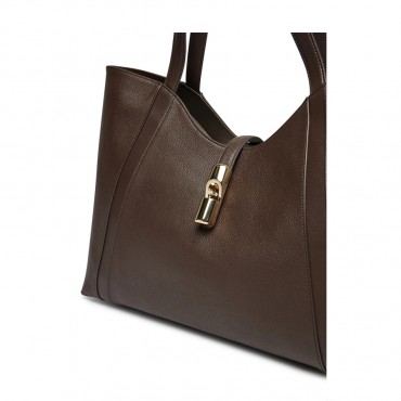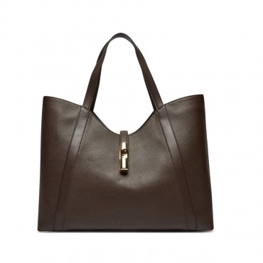 The fine garnet leather creates a material contrast with the details and double handles made of smooth leather that define the Furla Goccia bag. The soft and unstructured silhouette is enriched by a headband embellished with the new cyclic hardware with a weight decorated with the iconic Arco Furla logo that keeps the model closed. Proposed in extra large format is ideal for holding all the essentials and more. - Internal wall pocket with zip closure - Two internal pockets open to the wall - Metal feet - Furla logo printed on the front