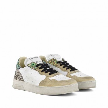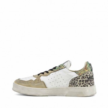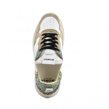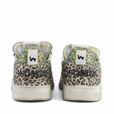 Women's sneaker model in suede and leather. Hyper is the sneaker that combines a romantic interpretation of street style and a vintage reference to the 80s. Comfortable and versatile. The upper of this model is made of white leather, dirty peige suede and leo print split details with iridescent glitter. The WOMSH logo is present on the heel.