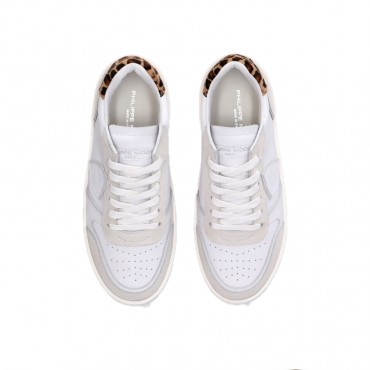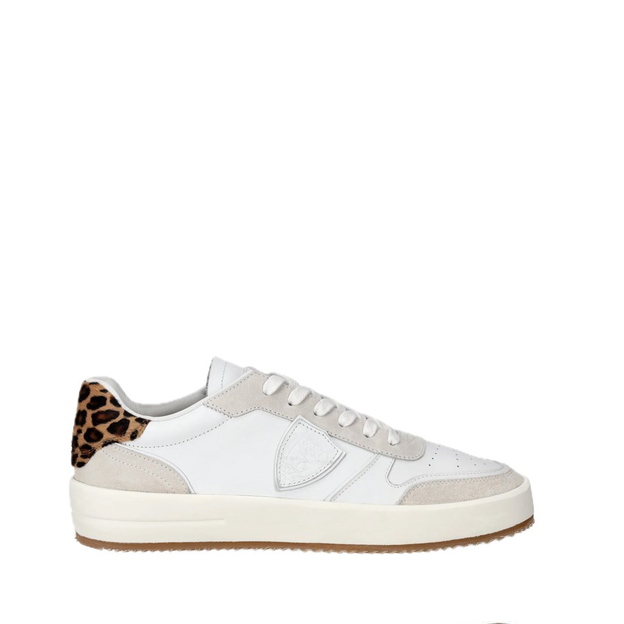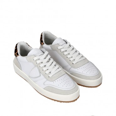 The gritty touch of the animalier ignites the glamour of this Nice sneaker. The calfskin and suede upper has essential lines, metropolitan, with perforations on the tip and cotton laces. The leopard horse dot adds a strong and feminine note. Rubber sole with handmade bandage.