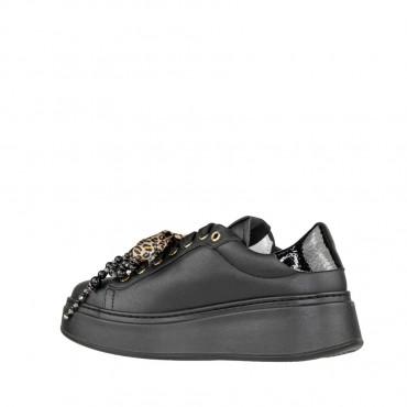 Women's sneakers in black calfskin with a distinctive animal print bow at the collar, removable gold-tone metal tortoiseshell black pearls, and a gold-tone metal bow. Matching black laces, ultra-lightweight, high, matching sole. Leather interior. Removable, washable memory foam insole.