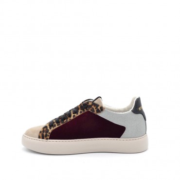 Original women's sneaker in beige suede and burgundy velvet. Glitter and pony finishes for a non-trivial look. Removable anatomical leather insole that guarantees comfort and well-being. 2.5 cm sewn cassette bottom. extremely soft and light.