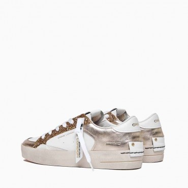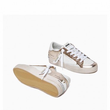 Women's shoe Converse model in a combination of high quality Italian leather white, platinum laminated leather and matching glitter piping with a white leather heel and light grey suede details