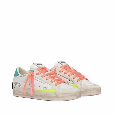 Crafted with high-quality Made in Italy materials, they feature a white leather upper enriched with fluorescent yellow crackle details that create a vibrant and contemporary contrast. The turquoise foil heel tab illuminates the design, while the white leather tongue with logo label and the black leather patch on the back enhance the brand's distinctive identity.