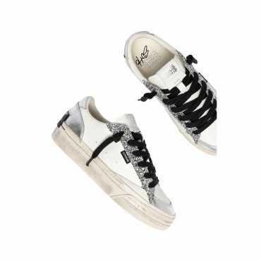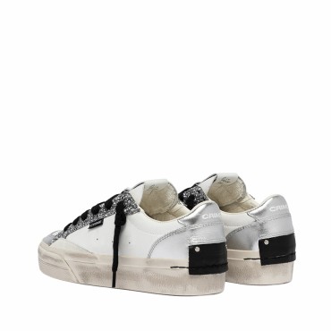 The white leather upper, enriched with delicate white suede details, creates a perfect balance between texture and hue. The silver foil heel and back panel add a bright, sophisticated touch, while the white leather tongue with logo label and black leather patch on the back add character and recognizability to the design.