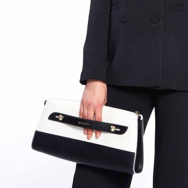 Modello borsa pochette L.A. color block con tracolla removibile ie fettuccia a mano in eco pelle. Chiusa con zip. La tracolla regolabile removibile per una trasportabilità a tracolla in catena metallica e materiale eco pelle in tinta. Logo sul fronte in metallo. Varianti in colore a contrasto.  Interno in tessuto con colore a contrasto. Con charms logo metallico.