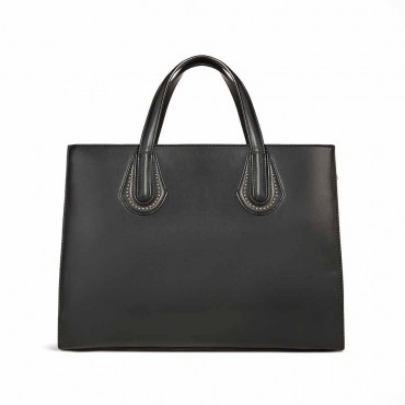 Modello borsa shopper verticale a 2 manici con tracolla removibile in eco pelle tinta unita. Decorazione con micro borchie in oro nei soffietti ai lati della borsa. Chiusa con zip. La tracolla regolabile removibile per una trasportabilità a tracolla. Logo sul fronte in metallo. Interno in tessuto con colore a contrasto. Con charms logo metallico.