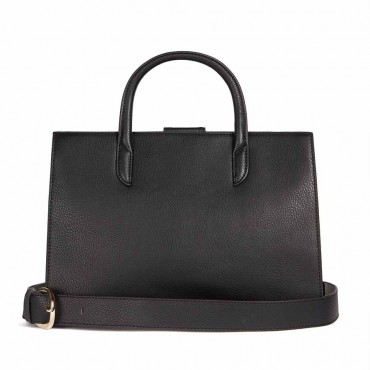 Modello borsa a mano a 2 manici con tracolla removibile in eco pelle tinta unita. Chiusa con zip centrale e passante trattenuto con bottone magnetico. La tracolla regolabile removibile per una trasportabilità a tracolla. Logo sul fronte in metallo. Interno in tessuto con colore a contrasto.