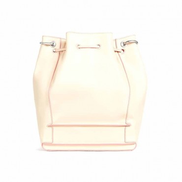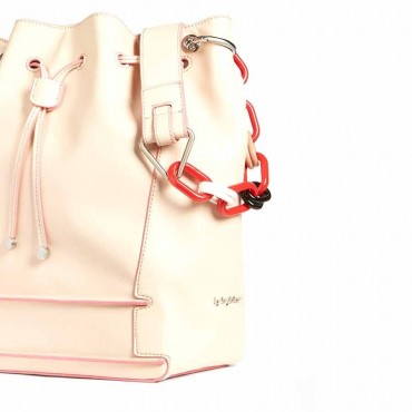 Modello borsa secchiello a spalla in eco pelle tinta unita. Chiusa con laccio infilato a chiudere. La tracolla in eco pelle in tinta è decorata con anelli rigidi accoppiati a contrasto di colore. Logo sul fronte in metallo. Interno in tessuto con colore a contrasto. Con charms logo metallico.