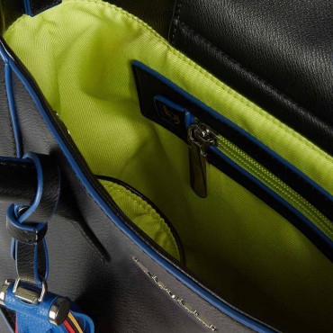 Modello borsa a mano a 2 manici con tracolla removibile in eco pelle tinta unita. Chiusa con patta interna trattenuta da bottone magnetico. La tracolla regolabile removibile per una trasportabilità a tracolla in eco pelle in tinta riporta decorazione definita da anelli rigidi accoppiati a contrasto di colore. Logo sul fronte in metallo. Interno in tessuto con colore a contrasto. Con charms logo metallico.