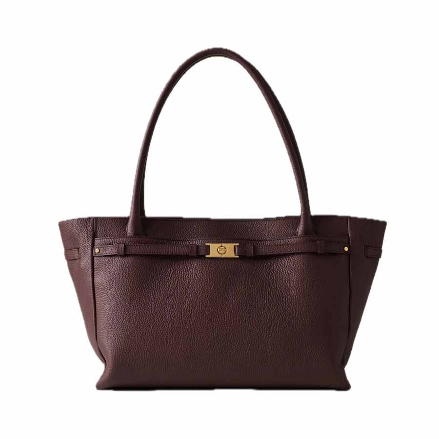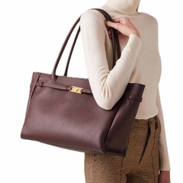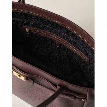 Modello borsa donna shopping large "La Torinese" in vitello stampato bottalato colore castano con chiusura con zip metallo e tirazip piastrina logata e Cinturino impreziosito da placchetta vite su tasca esterna chiusa con due magneti invisibili