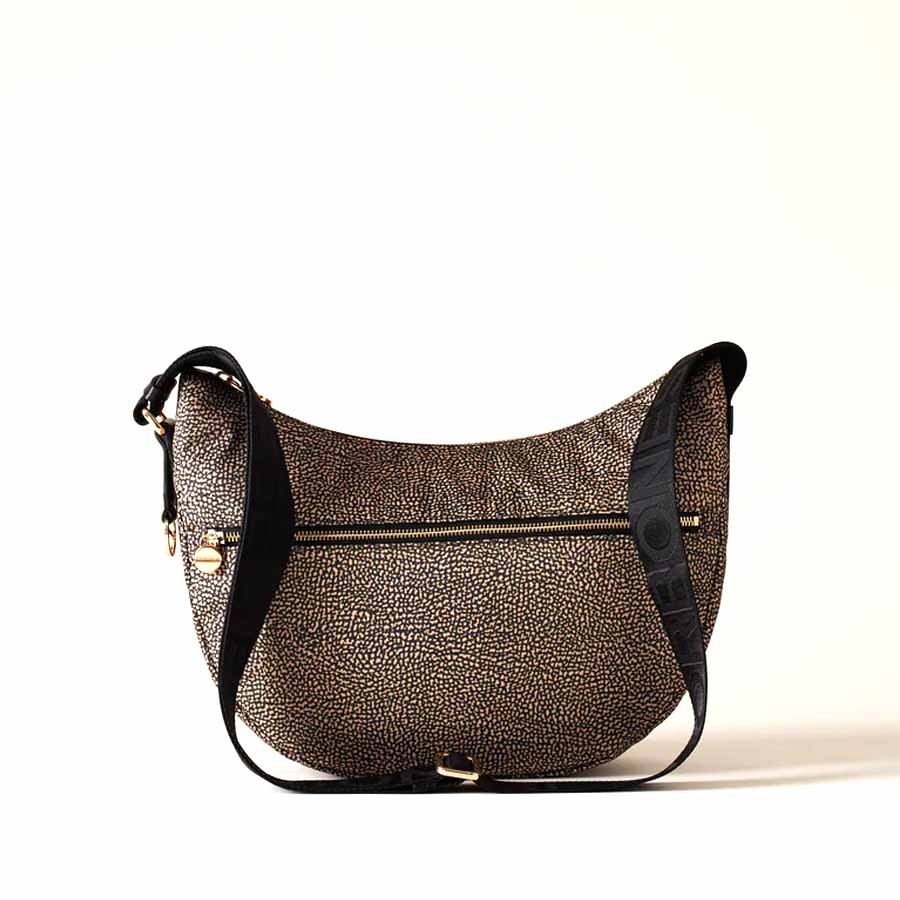 L'iconica Luna Bag di Borbonese è una "hobo" Middle della linea Eco Line realizzata in nylon OP riciclato e pelle. La cinghia per tracolla, regolabile, è in nastro di nylon logato con fibbia autobloccante. La chiusura è garantita da una zip con tiralampo a forma di vite stilizzata, simbolo del brand. L'interno, foderato in tessuto jacquard, ha tre tasche di cui una con cerniera lampo. Le metallerie sono in galvanica oro chiaro.