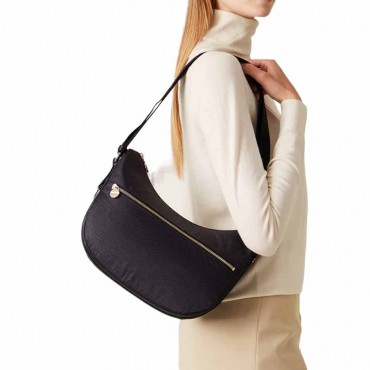 L'iconica Luna Bag di Borbonese è una "hobo" Middle della linea Eco Line realizzata in nylon OP riciclato e pelle. La cinghia per tracolla, regolabile, è in nastro di nylon logato con fibbia autobloccante. La chiusura è garantita da una zip con tiralampo a forma di vite stilizzata, simbolo del brand. L'interno, foderato in tessuto jacquard, ha tre tasche di cui una con cerniera lampo. Le metallerie sono in galvanica oro chiaro.