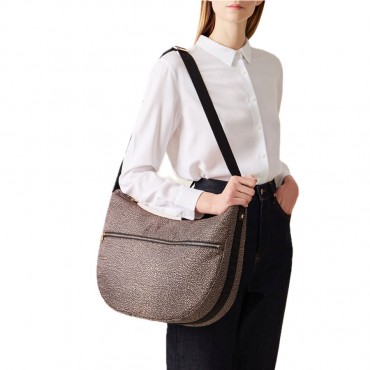 La tracolla è regolabile ed il nastro è interamente logato e passa attorno a tutta la borsa, facendone mantenere così la forma a mezzaluna nonostante la sua morbidezza. l'iconica Luna Bag di Borbonese è una "hobo" Medium della linea Eco Line realizzata in nylon OP riciclato e pelle. La cinghia per tracolla, regolabile, è in nastro di nylon logato con fibbia autobloccante. La chiusura è garantita da una zip con tiralampo a forma di vite stilizzata, simbolo del brand. L'interno, foderato in tessuto jacquard, ha tre tasche di cui una con cerniera lampo. Le metallerie sono in galvanica oro chiaro.