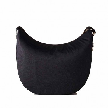 La tracolla è regolabile ed il nastro è interamente logato e passa attorno a tutta la borsa, facendone mantenere così la forma a mezzaluna nonostante la sua morbidezza. l'iconica Luna Bag di Borbonese è una "hobo" Medium della linea Eco Line realizzata in nylon OP riciclato e pelle. La cinghia per tracolla, regolabile, è in nastro di nylon logato con fibbia autobloccante. La chiusura è garantita da una zip con tiralampo a forma di vite stilizzata, simbolo del brand. L'interno, foderato in tessuto jacquard, ha tre tasche di cui una con cerniera lampo. Le metallerie sono in galvanica oro chiaro.