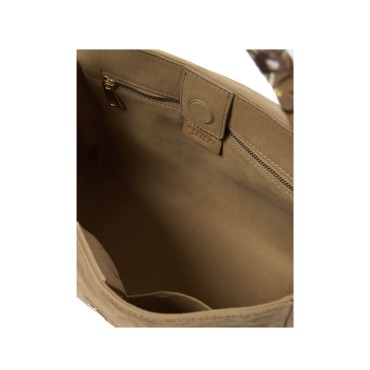 Tasche: tre taschini interni, di cui uno con zip Chiusura: patta con bottone magnetico interno Funzionalità: apertura a scomparsa sulla parte alta della patta / tracolla regolabile removibile Materiale: pelle scamosciata / manico in pelle di vitello liscia con ricami Dettagli: metallerie finitura oro chiaro