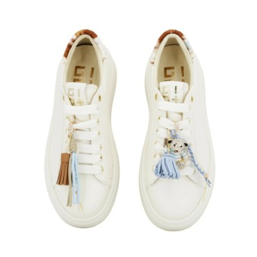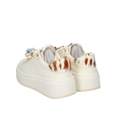 Le Sneakers donna Gio+ uniscono design contemporaneo e dettagli ricercati in un modello dallo stile originale e distintivo. Realizzate in morbida pelle di vitello colore bianco latte, si distinguono per la particolare tallonetta in cavallino stampa mucca beige e marrone, che dona carattere e personalità alla calzatura.