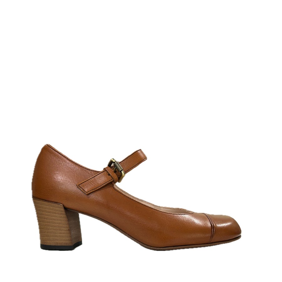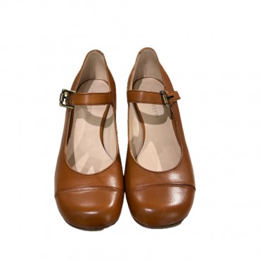 Decolettè da donna con cinturino in pelle delavè sughero tamponato e cucito a mano.