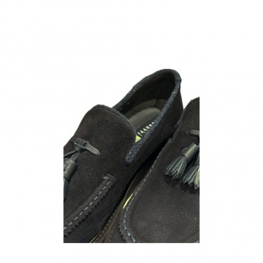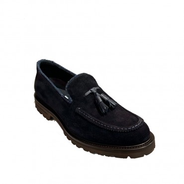Mocassino realizzato in pelle scamosciata color marine. Calzatura dallo stile classico ed esclusivo, perfetto connubio tra aspetto formale e carattere distintivo. Suola extraligth in poliuretano con guardolo cucito a mano, caratterizzata da uno strato superiore morbido e flessibile per il comfort del piede, il battistrada garantisce invece robustezza e grip antiscivolo.