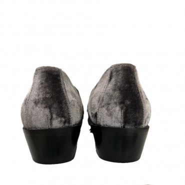 Mocassino da donna su tacco di 3 cm, realizzato in un elegante e setato velluto grigio con riporti in pelle d’agnello dello stesso colore, arricchito da un accessorio morsetto oro ambrato che riprende il logo RF di Roberto Festa. La forma affusolata e comoda rende questa calzatura ideale per un look sofisticato e senza tempo.