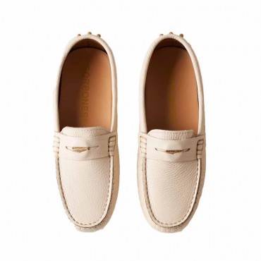 Modello mocassino donna in pelle beige. Ispirato alle car shoe, il mocassino creato da Borbonese è cucito completamente a mano. La tomaia di morbidissima pelle rende la calzatura leggera, comoda e perfetta per tanti tipi di look . Pelle di vitello bottalato Vite decorativa inserita nella mascherina Totalmente cucita a mano Interno e sottopiede di pelle Soletta estraibile Fondo con gommini TPU