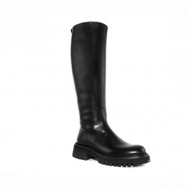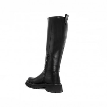 Stivale alto in pelle nera con cuciture tono su tono, pull tab sul retro, suola in gomma, altezza 4 mm