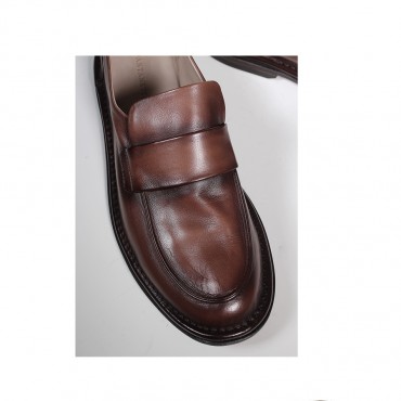 Mocassino tubolare con lavorazione SAN CRISPINO flat in morbida pelle delavè colore marrone effetto vintage.