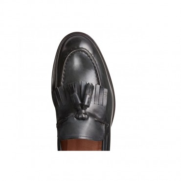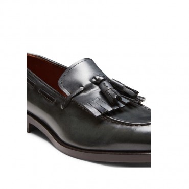 L'iconico mocassino Brera si presenta in versione ricercata, le nappine e la frangia in pelle in tono combinano estetica contemporanea e artigianalità. La pelle color grigio grafite si caratterizza per un'esclusiva lavorazione artigianale che dona un effetto anticato e una maggiore lucentezza. Suola in cuoio con mezzo tacco in gomma.